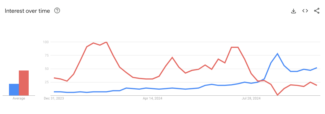 根據 Google Trends 顯示,吉伊卡哇的搜尋熱度在最近幾週已經超越寶可夢,兩邊出現了黃金交叉,吉伊卡哇的搜尋量一飛沖天,呈現指數型成長。